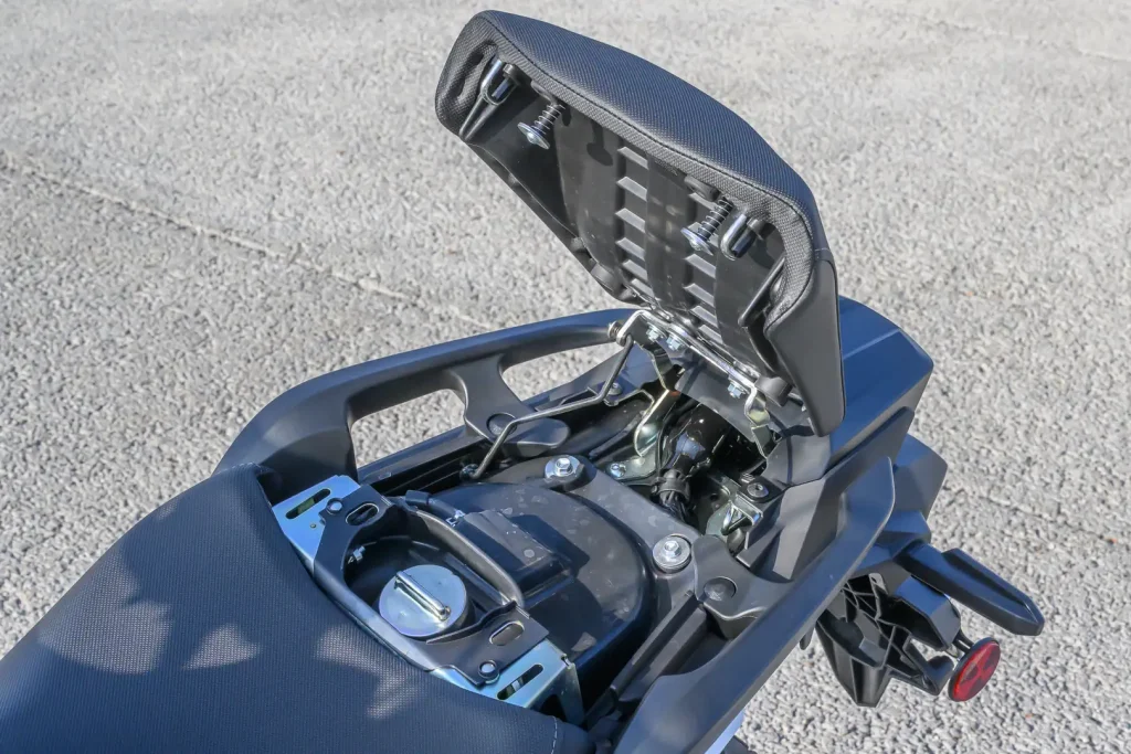 - With storage where the fuel tank is, you pop up the passenger seat to access the filler cap. The same key you use for ignition goes into another keyhole assembly at the top of the storage box. Turn it one way to open the passenger seat and the other to unlock the storage box.