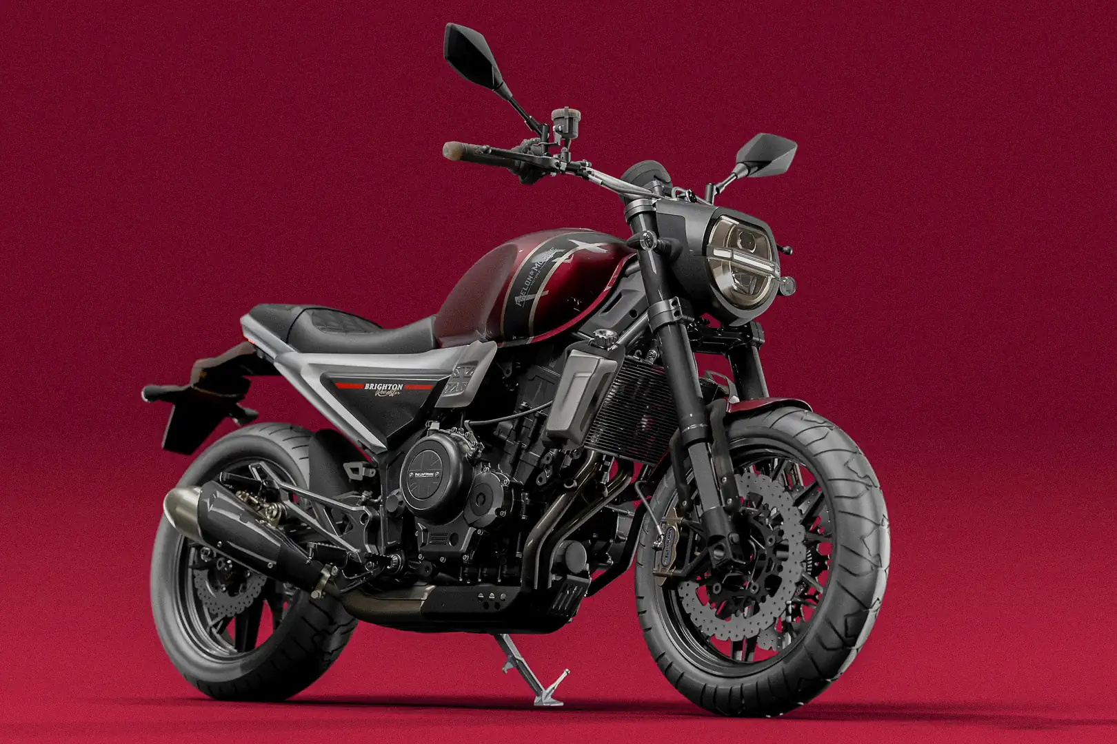 The Brighton 6 is offered in two variants: the retro café racer style Roadster and the light-duty off-roadable Scrambler. Both share the same engine, frame, and core components. The most significant differences are the wheels, tires, and suspension tuning, and the Scrambler has handguards, a skid plate, and grippy tank pads.