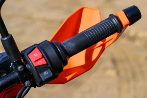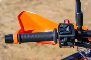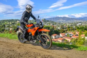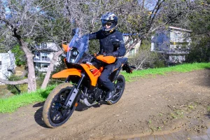 - The urban-focused 390 Adventure X is dirt road capable. Switch the ABS into Offroad mode to disable rear-wheel ABS for your off-pavement forays, and you’ll find the X is capable. Sure, it doesn’t have the full-sized off-road wheels, but the 19/17 wheelset and longish wheel travel combine to give the Adventure X some dirt legs. The Apollo Tramplr XR’s 70/30 street/dirt bias is fine for dirt roads that aren’t challenging. I did some testing after an atmospheric river flowed through, and the tires balled up with mud immediately, though most ADV tires would. There’s over nine inches of ground clearance to help clear rocks and roots, which is good. Helpfully, the X’s low seat height gives confidence to those unfamiliar with riding when traction is uncertain.