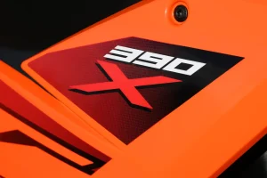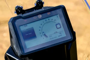 - The 390 X has a five-inch LCD dash and familiar switchgear. There’s not a lot to navigate via the four-button toggle switch on the left switchgear. The menu is basic, with five sub-menus covering ABS, bike info, trip info, navigation, and a music player. You’ll need to download the KTMconnect app and pair it with your smartphone and helmet headset to take advantage of the navigation and audio features. A powered USB-C port is available just behind the LCD screen on the left side.