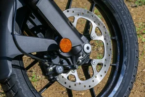 - A single 320mm disc with a two-piston ByBre caliper is enough to slow the lightweight 390 Adventure X. The initial bite is friendly and soft, ramping up to impressive braking when you put the squeeze on. This is perfect, as it won’t get you into trouble should you grab a bit too hard in traffic. I felt equally backed up when running the 390 X at high speeds, though supplemented with the rear brake a few times when I got ahead of myself. ABS is standard and non-intrusive, even during mild off-roading.