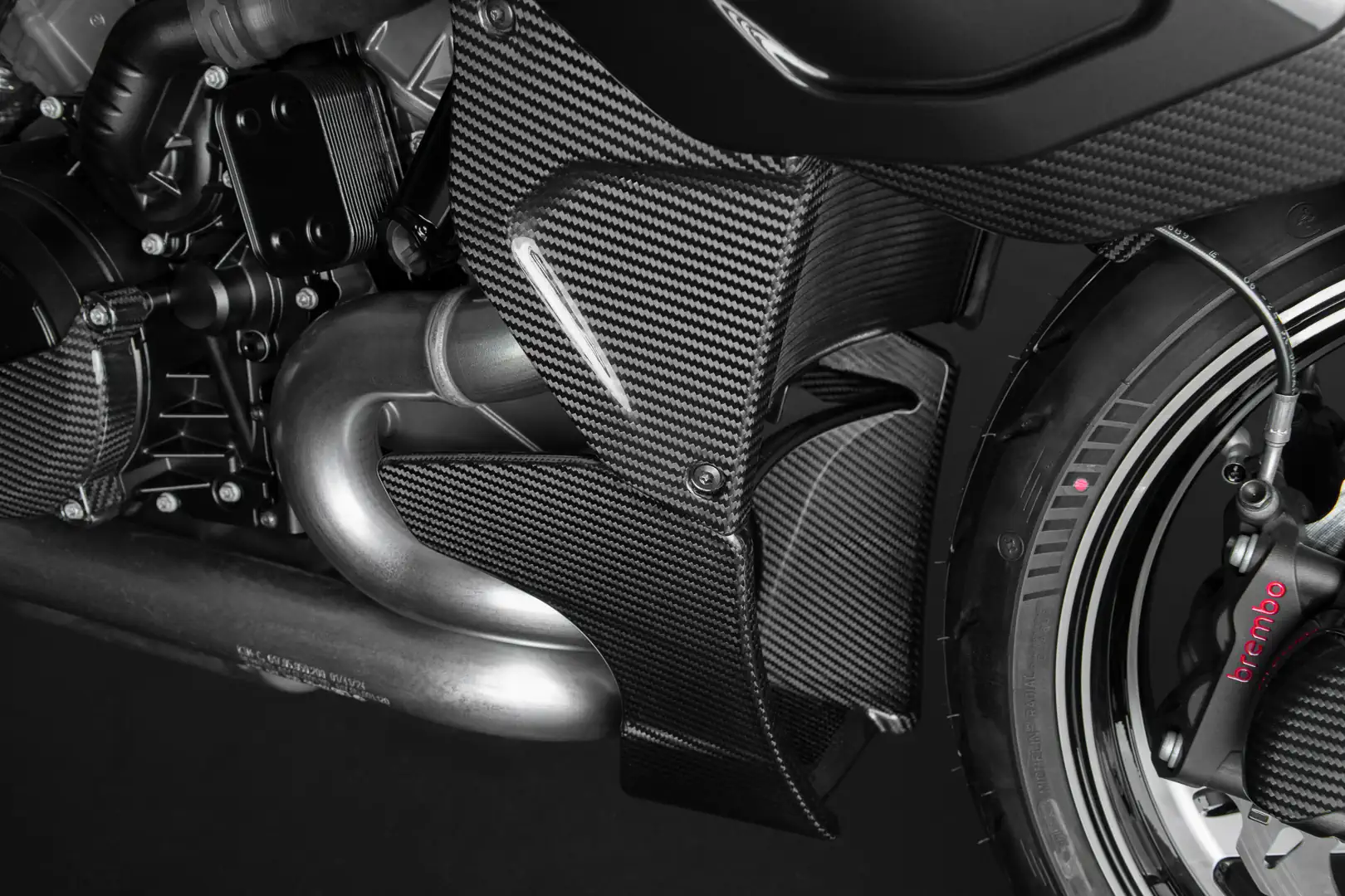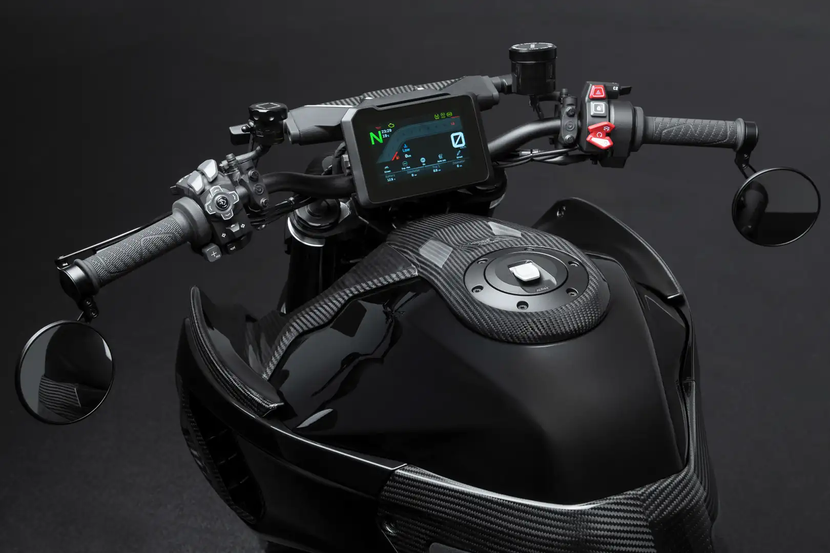- The Brabus has distinctive, imposing bodywork. Brabus calls it the Widestar kit, and it features high-gloss carbon fiber front fender, radiator shrouds, chin fairing, swingarm cover, tail section, and additional protective pieces.