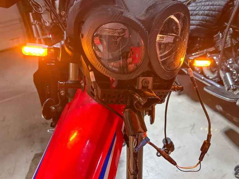 The Honda CRF300L Rally is wired so the front turn signals function as DRLs. They are so bright, they can be mistaken for amber fog lamps. Once installed, there is nothing left to do except appreciate your 5.6-ounce weight savings, increased visibility in traffic, and the knowledge that you won’t be breaking these turn signals no matter how often you fall.