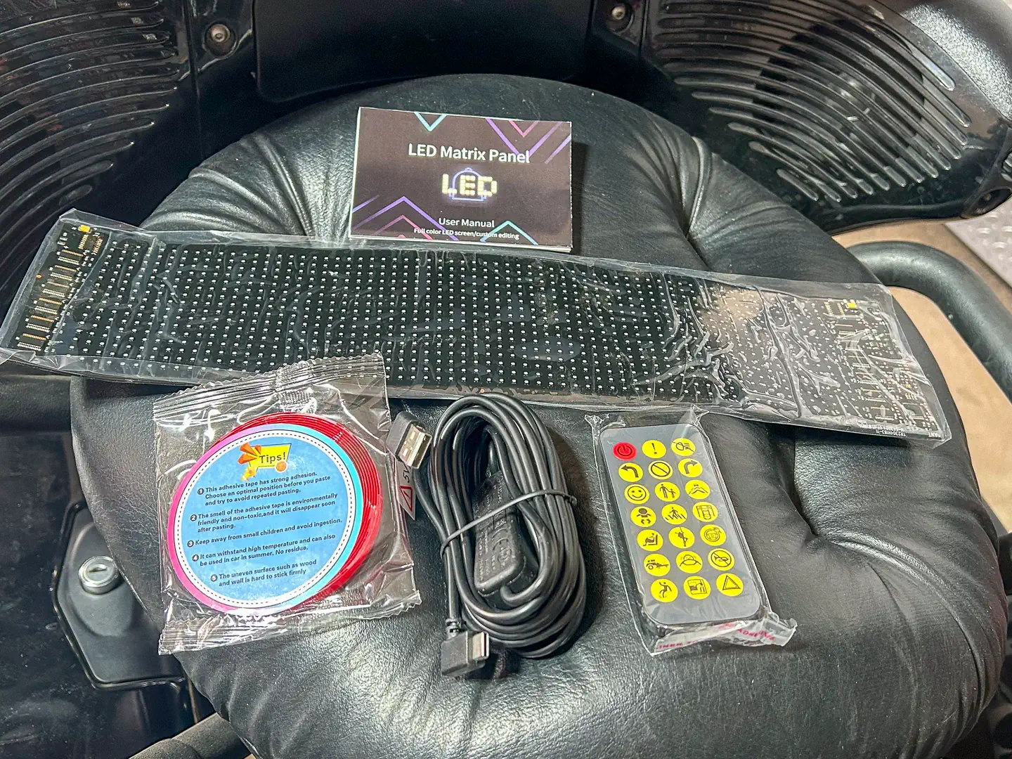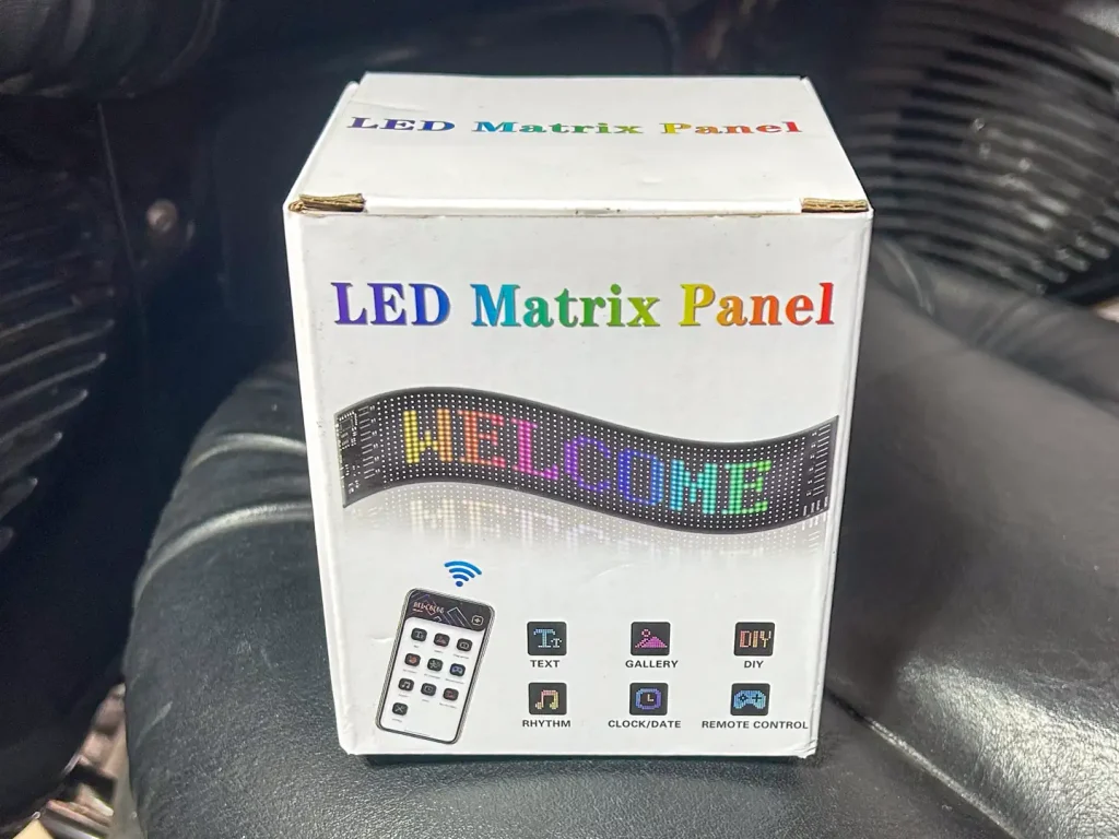The package includes a water-resistant display, an extra-long water-resistant USB-A-to-USB-C cable with an inline on/off switch, a compact 21-button remote control, double-sided tape, and an instruction manual. iPixel, a free smartphone app for iOS and Android, connects via Bluetooth and provides complete control, including the ability to create and upload custom animations or text.