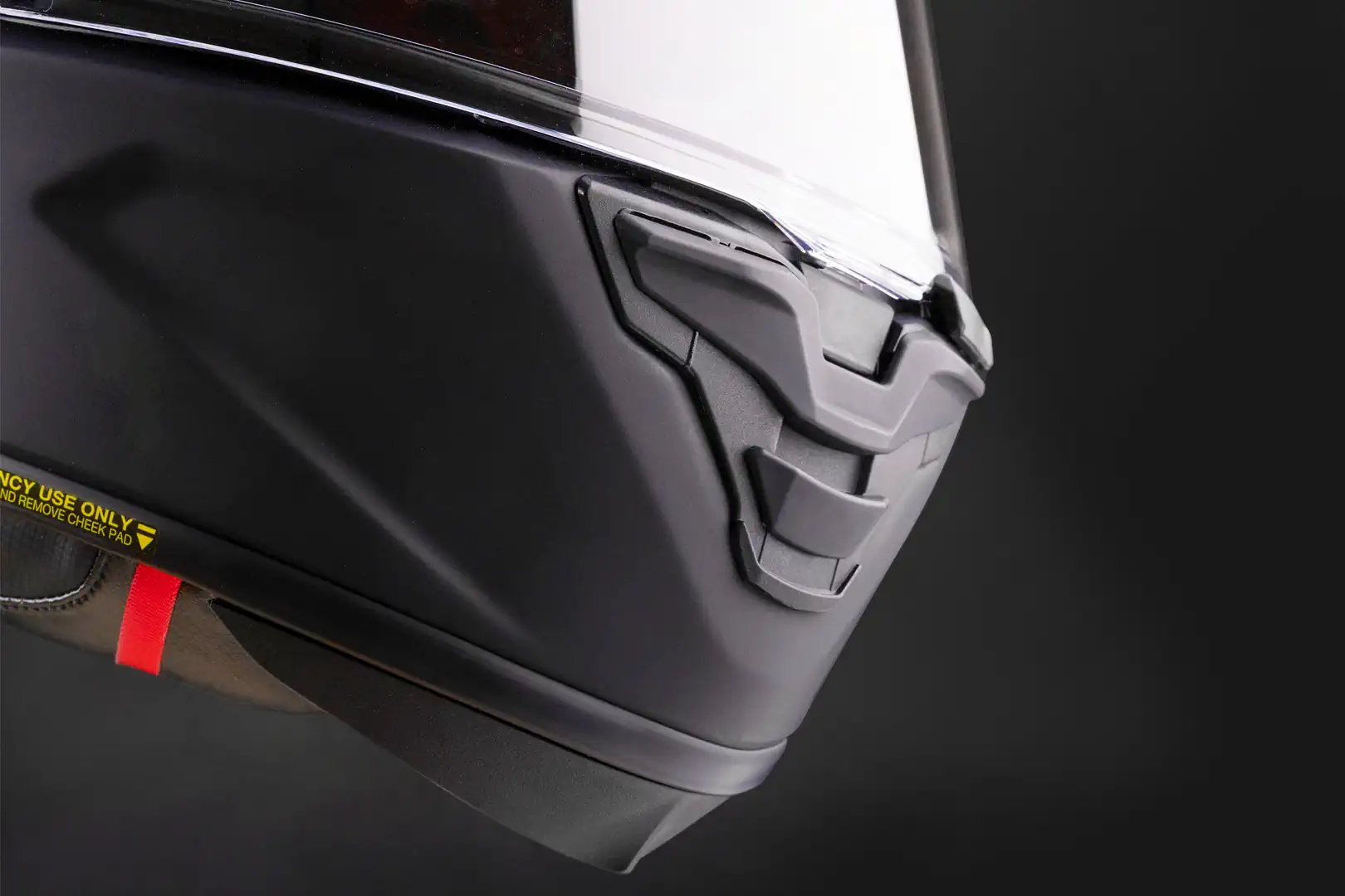 Finally, the Emergency Quick Release System allows trained personnel to remove the cheek pads before removing the helmet, reducing risk of unintended neck injuries in the event of a crash.