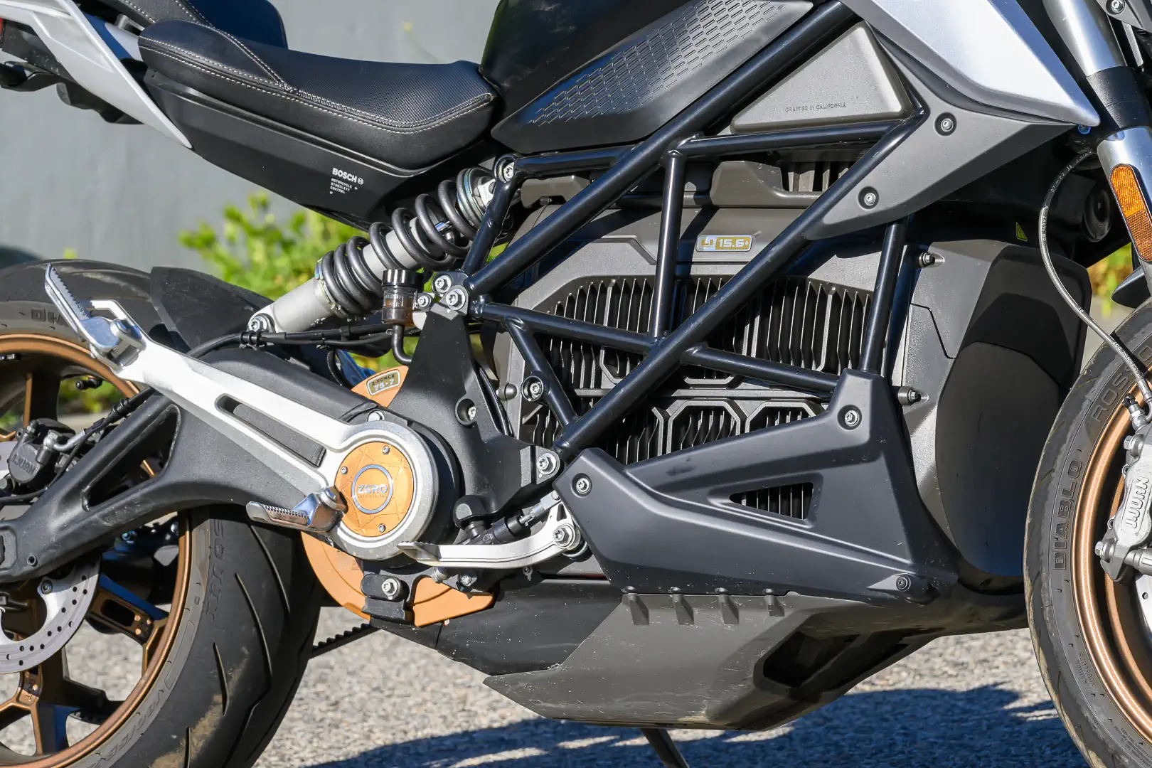Now, we’ll go over the range and charging performance that you get from the Z-Force 14.4 kWh lithium-ion battery, the same battery used on the DS. The range, as is the case with conventional motorcycles, depends on how you ride it. For instance, freeway commuters can coax about 100 miles out of a charge. City riders could get up to 154 miles while working through red lights and stop signs. Charging the battery from a 120-volt outlet at home will take 9.2 hours if the battery is flat, with that dropping to 5.8 hours for the charging sweet spot of 20 to 80 percent. The optional $3000 Rapid Charger cuts the 20 to 80 percent charge time to 49 minutes, though you’ll need the infrastructure to support it. Our experience is that 120-volt charge numbers are pretty accurate, as we didn’t have the Rapid Charger.