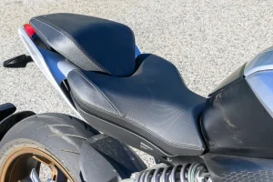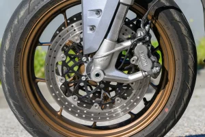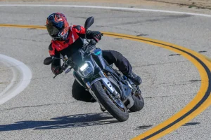 Senior Editor Nic de Sena and I experienced the same challenges that Kelly did. Nic is a strong guy, yet he still struggled to properly set the S up for a tight corner when riding hard. I rely on smoothness, and the S’s hesitant-then-abrupt turn-in makes that difficult if I’m riding at anything harder than a casual pace. This issue persists, even though Nic prefers the low-regen Sport mode for its lighter and more consistent engine braking during deceleration. Meanwhile, Kelly and I rely on the high-regen Canyon mode. Braking is a strong point, between the radially mounted J.Juan calipers and the sticky Pirellis. The issue is changing direction smoothly and predictably.