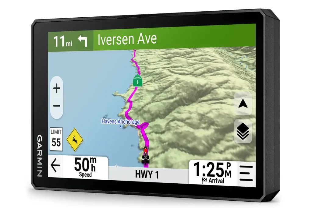 Garmin includes its Adventurous Routing feature, which prioritizes curvier or hillier roads when planning routes. The device also highlights popular motorcycle routes shared by other users.