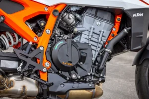 - When KTM launched the nearly liter-size 947cc LC8c parallel-twin in the base-model 990 Duke, it staked its claim in the exceedingly broad class. With lovely bottom-end torque and massive midrange giving this steed an oh-so-fitting snotty attitude, lofting the front wheel is a mere throttle snap away. Yet, the Ready To Race brand wouldn’t recycle the powerplant into an R-badged bike without upgrades. Thankfully, the 990 Duke R’s model-specific tune adds an extra septuplet of ponies to the barn, bringing figures up to 128 horsepower at 9500 rpm and 76 lb-ft of torque at 6750 rpm, the same as the fully faired 990 RC R supersport. Bolt for bolt, it is the same mill found across all current 990 platform models. That’s not a bad thing because the perks of a punchy twin-cylinder lump fill the role so well.
