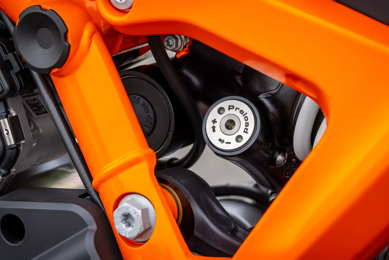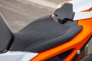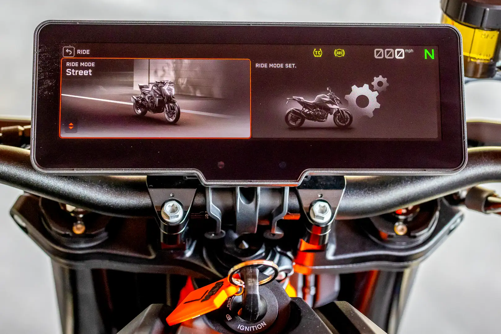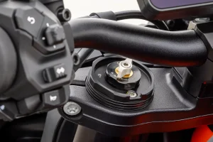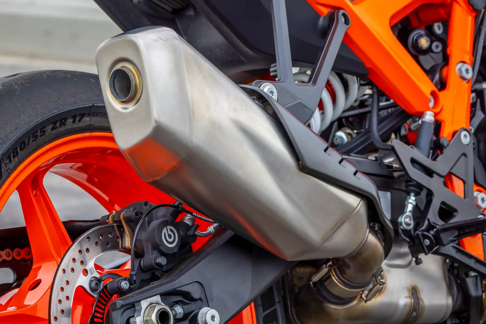 - Braking comes to us by way of Brembo. A point of interest to eagle-eyed spec-sheet warriors is that the R’s Brembo Stylema calipers and 320mm rotors are a clear step above the J.Juan binders and 300mm discs on the base Duke. We have extra feel and stopping power, as well as the swish Brembo MCS span-and-ratio adjustable master cylinder. While on the subject of stopping, ABS modes expand to four total settings: Road, Sport, Supermoto+, and Supermoto. Road is self-explanatory, while Sport lessens the leash in aggressive road settings. Supermoto is front-only ABS, leaving it up to the rider to use the rear brake. Meanwhile, Supermoto+ modulates the rear brake and allows riders to kick the rear out roughly eight degrees before intervening. In either of the Supermoto-dubbed settings, cornering ABS is disabled, making them the preferred option for racetrack use.
