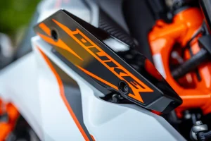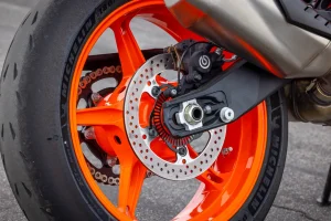 - While Michelin Power Cup 2 tires are standard, we were treated to Dunlop Sportmax Slick rubber for the racetrack. The Power Cup 2 is essentially a road-legal track day tire, meaning it is exceedingly capable in the canyons and won’t shy away from laps at pace. KTM North America wanted to extract a little extra zhuzh from our test units and mounted Dunlop Sportmax Slick R7 front and R8 rear compounds. These are certainly on the harder end of the brand’s compound spectrum, and were chosen mainly for their durability. Slides, squirms, and the like were predictable through our four 30-minute sessions, while their wholly respectable grip remained consistent as laps wore on. There is, perhaps, not as much outright grip as seen in the competition, though not nearly the same drop off.