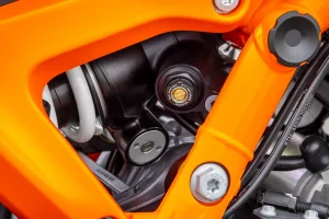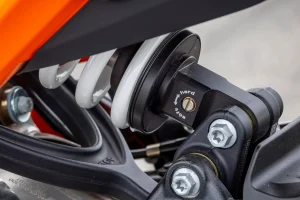 - While the frame is mostly the same as the 990 Duke, what’s bolted onto it is quite different. Another RC R carryover is the unique wishbone-style progressive linkage, which connects the fully adjustable shock to the RC R-pilfered swingarm, which is said to be 34 percent less rigid than on the base-model Duke. Together, they add a healthy dose of streetwise suppleness to the mix. Said swingarm is angled more steeply for handling enthusiasm. Put simply, the linkage enables engineers to do more with less, lighter spring rates and valving to achieve superior ride quality and support over direct-mount alternatives. In fact, this is the first middleweight Duke with linkage.