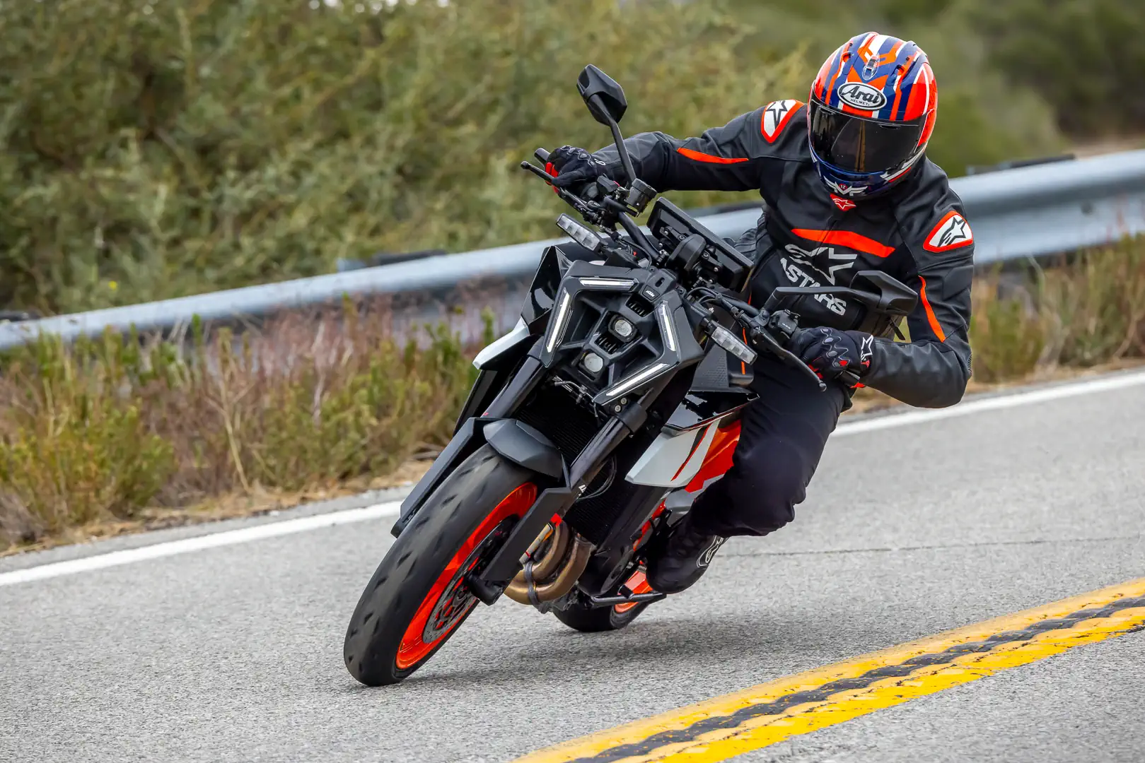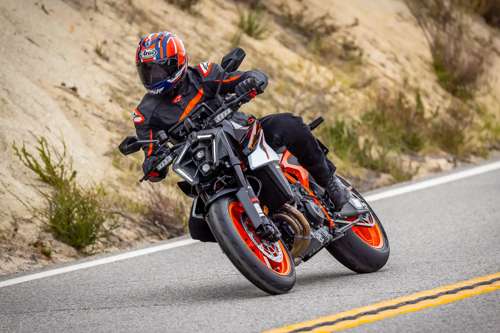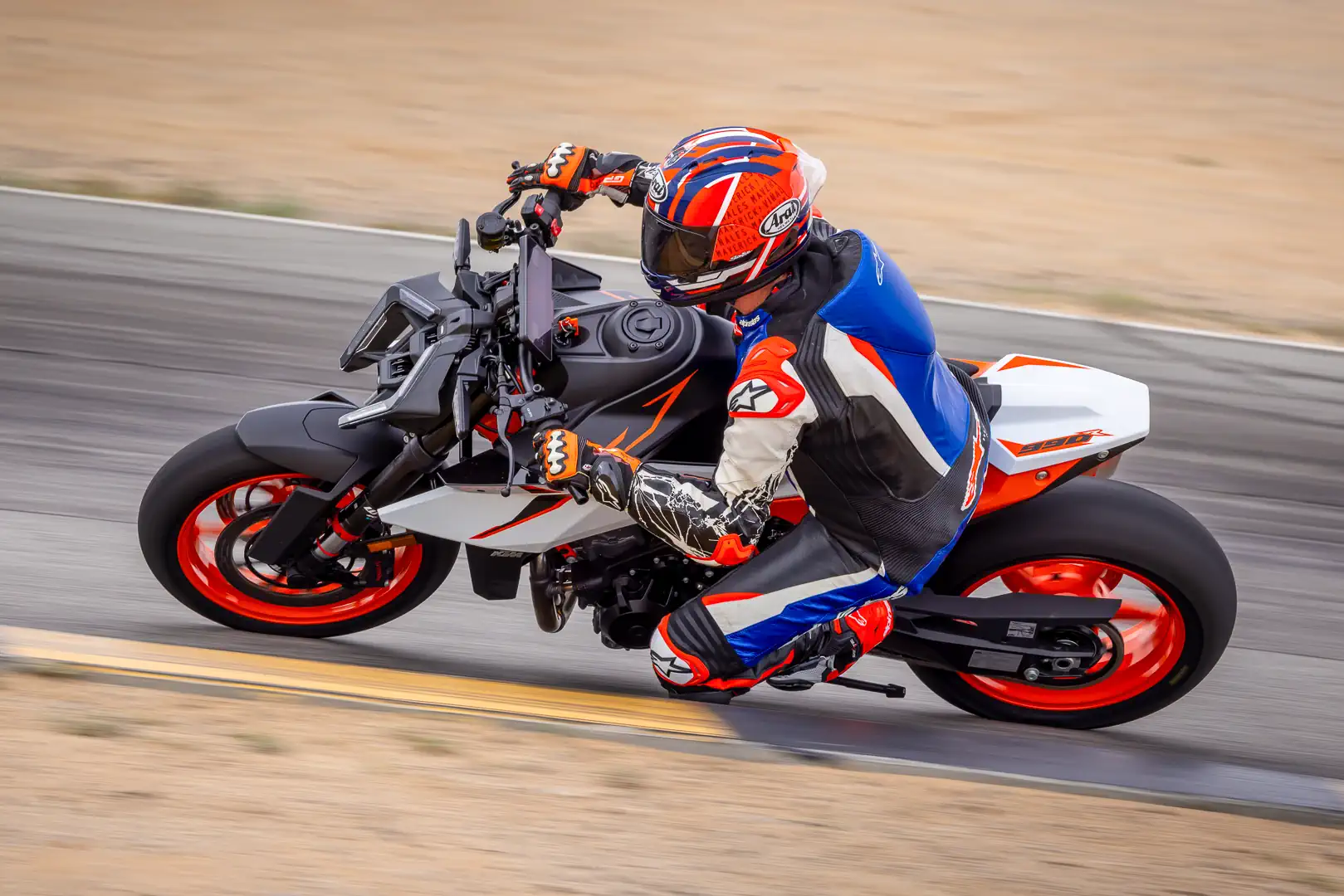 - Here’s how the suspension stuff shakes out, friends. According to KTM staffers, a primary design goal is always to make its street motorcycles perform as well as possible at the racetrack, as long as that doesn’t compromise its roadworthiness. It’s a reassuringly practical take from a brand known for its lack of subtlety. Naturally, there will be some goalpost shuffling, depending on the product. Still, the 990 Duke R is a street bike first and foremost. Sure, stiffening the stock springs and/or valving would potentially make it a better track weapon for my 190-plus-pound frame. Conversely, tuning for racetrack use chips away at its excellent compliance and grip on the road. So, what we’re left with is one hell of a road bike that can also hang at track days. We can’t have it all, but we can often get close.