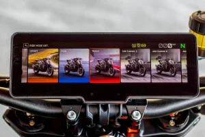 - An updated electronics suite comes into the fold. A six-axis IMU informs the usual assortment of traction control, wheelie control, cornering ABS, and more. They work as advertised, with a particular nod going to the WC. Accompanying that, we have four standard ride modes: Rain, Street, Sport, and Custom. Track and two additional modes are optional. Throttle mapping is well-attenuated, save for a hint of initial roll-on snatch in sportier settings. Track mode is darn sharp with an energetic response that’s fun in the canyons, though not quite as useful at the racetrack, where lean angles and risks are higher. Sport is the sweet spot, providing good authority in any environment. Meanwhile, Street is almost too soft off the bottom, giving Rain a run for its money.
