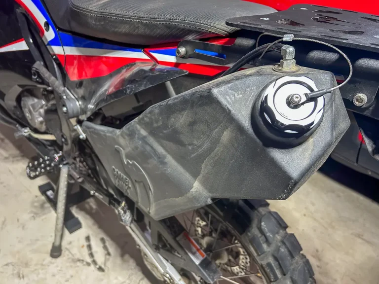 The standard Honda CRF300L Rally has a 3.4-gallon fuel tank. With my heavy throttle hand, that can be as few as 183 miles to walking. Having the option to add 70 more miles between gas stops comes in handy for backcountry exploring, especially on multi-day trail rides.