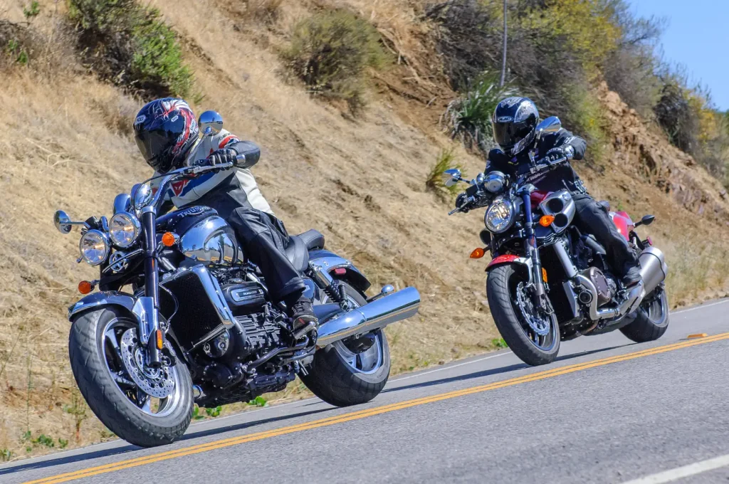 The VMax feels more urgent and instant than the Roadster, but the Triumph seems to smile back, secure in the knowledge that it is carrying the big 2300-caliber gun. The Rocket III puts out considerably more torque just off idle than the VMax does at its peak, and its monstrous maximum 147 lb-ft of pulling power could raise the Titanic, if you found a chain strong enough.