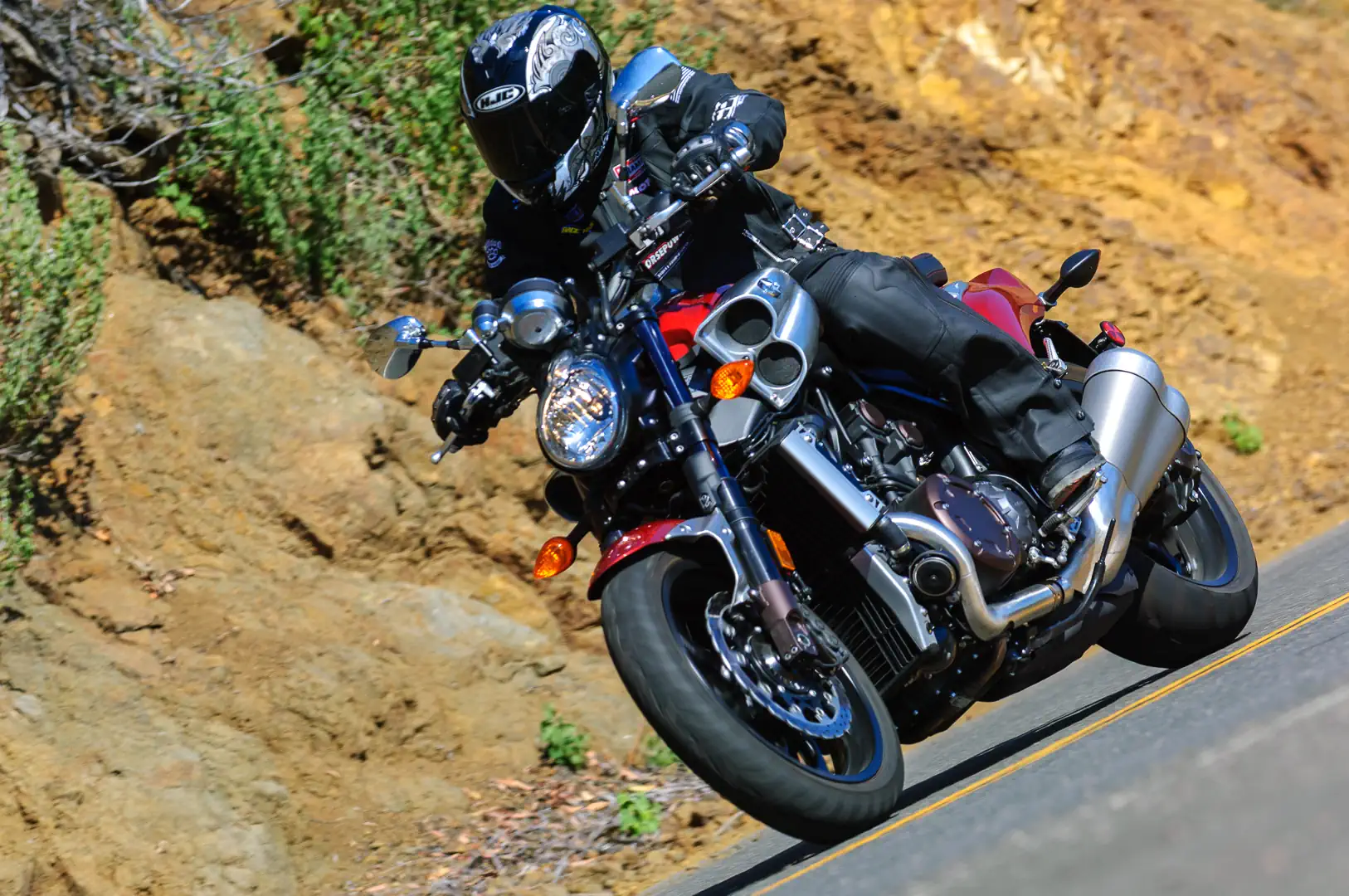 The VMax engine needs a few revs and doesn’t even hit its torque peak until 5000 rpm, but because the motor has much less flywheel effect than the Roadster, it spins up quickly and keeps building its ferocious power until its 9500 rpm redline. The light switch nature of the VMax’s fueling and low-inertia engine can make for a jerky ride, particularly in first gear at low rpm, so you have to finesse the throttle.