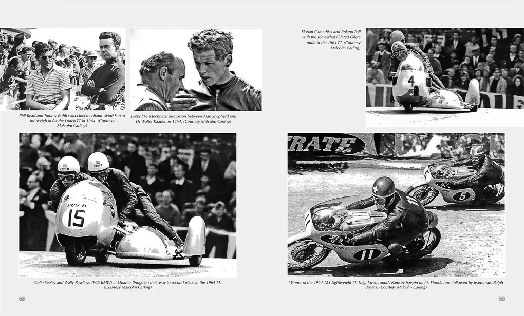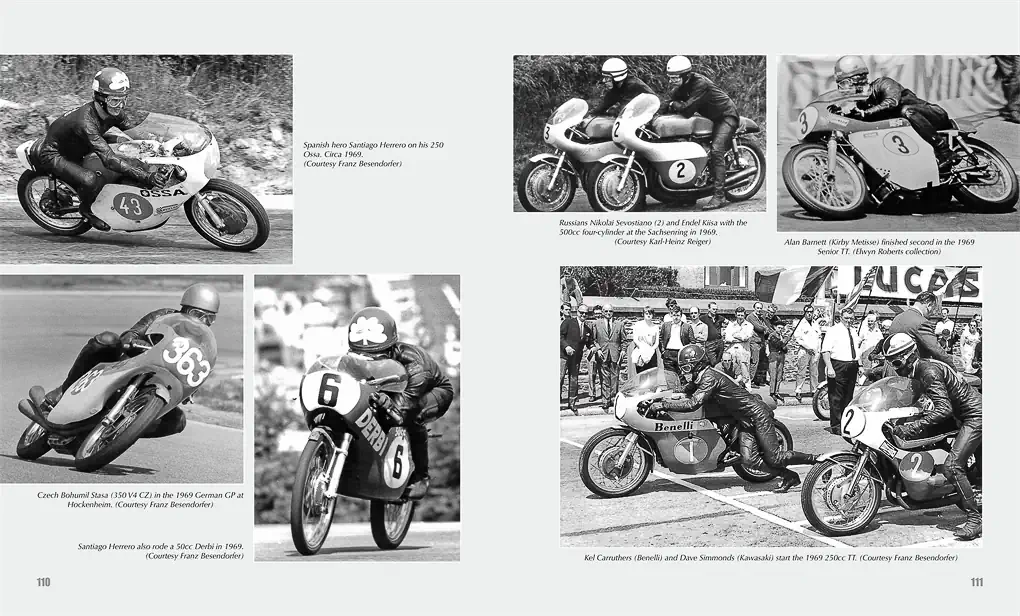 Those remarkable period photographs are the contributions of professionals Malcolm Carling, Franz Besendorfer, Karl-Heinz Reiger, Luigi Taveri, Elwin Roberts, Karl-Gunter Peters, and Martyn Harris. Pereira also brought along Roger Oliver’s historical research resources to enrich the narrative.