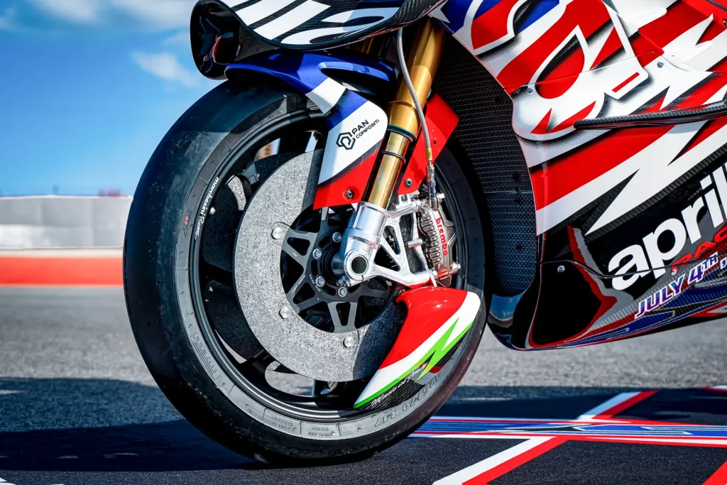 - Yes, your eyes do not deceive you: you’re staring at a full-carbon braking system on a bike you can buy (if you sell a few kidneys). Aprilia says the X 250TH is the first production motorcycle equipped with carbon-carbon brake discs, paired with carbon pads and Brembo GP4-MS billet-aluminum calipers — all MotoGP-grade hardware. However, Ducati is also making the same claim with the limited-edition Ducati Superleggera V4 Centenario, also unveiled at the 2026 MotoGP Grand Prix of the Americas. The 340mm high-mass discs weigh approximately 50 percent less than the steel rotors they replace, significantly reducing gyroscopic forces. Meanwhile, the pads are about one-third lighter than sintered equivalents, also improving thermal efficiency and braking performance under extreme conditions.