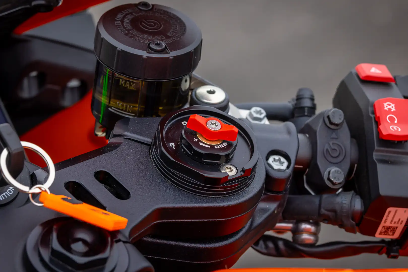 - What goes fast must slow down, and Brembo handles that. Braking is handled by 320mm discs and Brembo’s latest Hypure calipers from Brembo. The 2026 KTM RC R is the first supersport in its class to feature this setup. Compared with the well-known Stylema calipers, Hypure grippers provide a softer initial bite with a more linear feel, which means slightly more lever pressure is initially required. The result is highly precise braking and excellent control on both street and track.