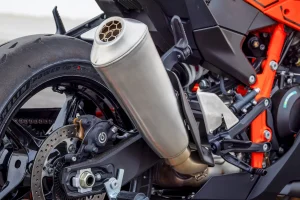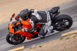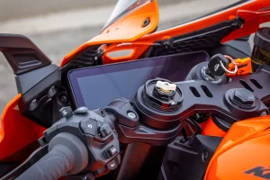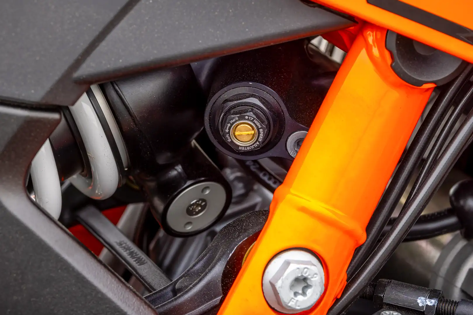 - Suspension duties are handled by fully adjustable WP Apex units. Along with the 48mm inverted fork, the 990 RC R gets a linear-spring-rate shock, ideal for consistent track performance, though it sacrifices some street comfort. The linkage system helps absorb road imperfections while maintaining precise handling. The result exceeded expectations. On the road, the RC R feels surprisingly composed and civilized. On track, after switching to KTM’s recommended closed-course settings, the bike delivers confident cornering and excellent feedback.
