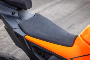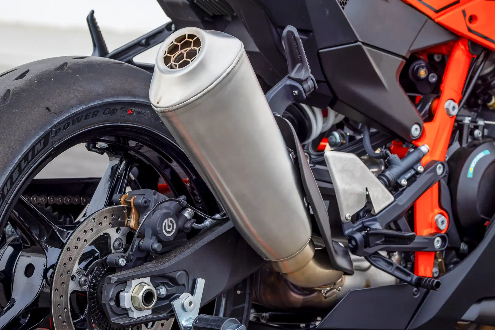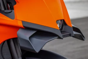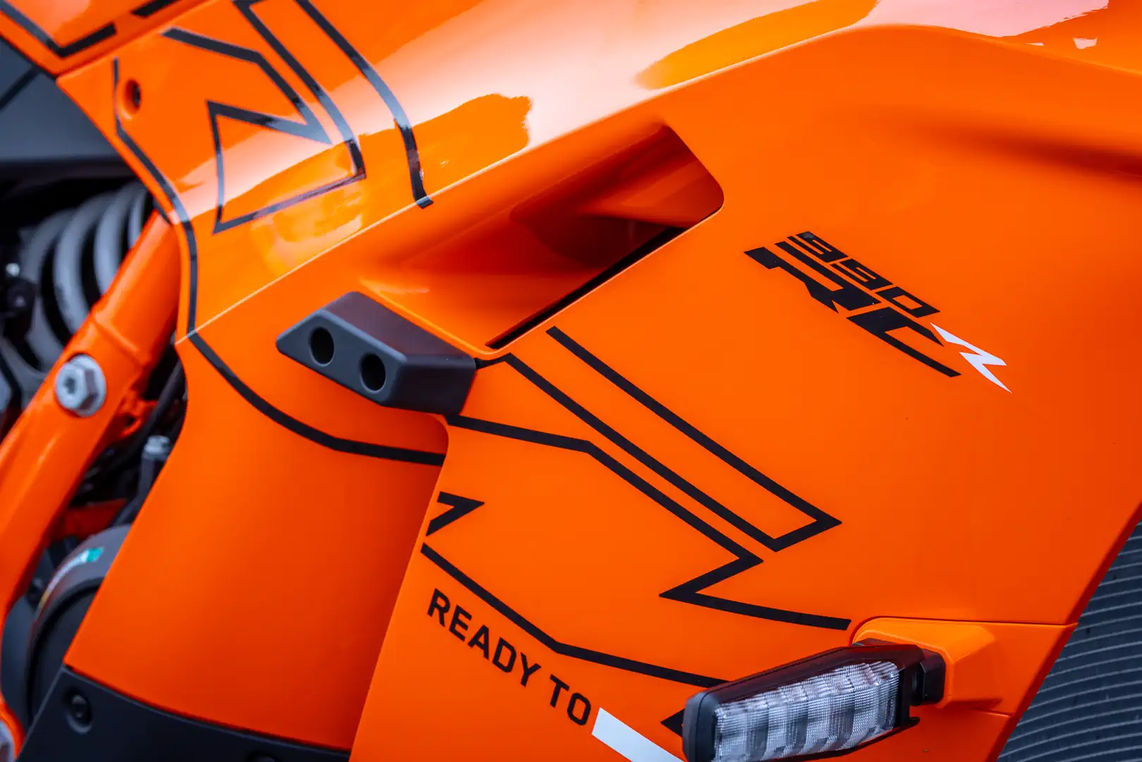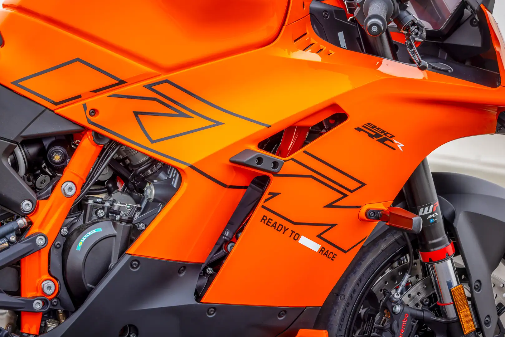 - The 990 RC R’s fit and finish are genuinely impressive for its price point. MotoGP-inspired aerodynamics appear on the front fairing, beneath the radiator, and ahead of the rear tire, reinforcing KTM’s #ReadyToRace aesthetic. Our test bike’s bright orange paint made the sharp bodywork stand out even more. The seamless transition between the upper and lower fairings, combined with the race-style seat, creates a very cohesive design.