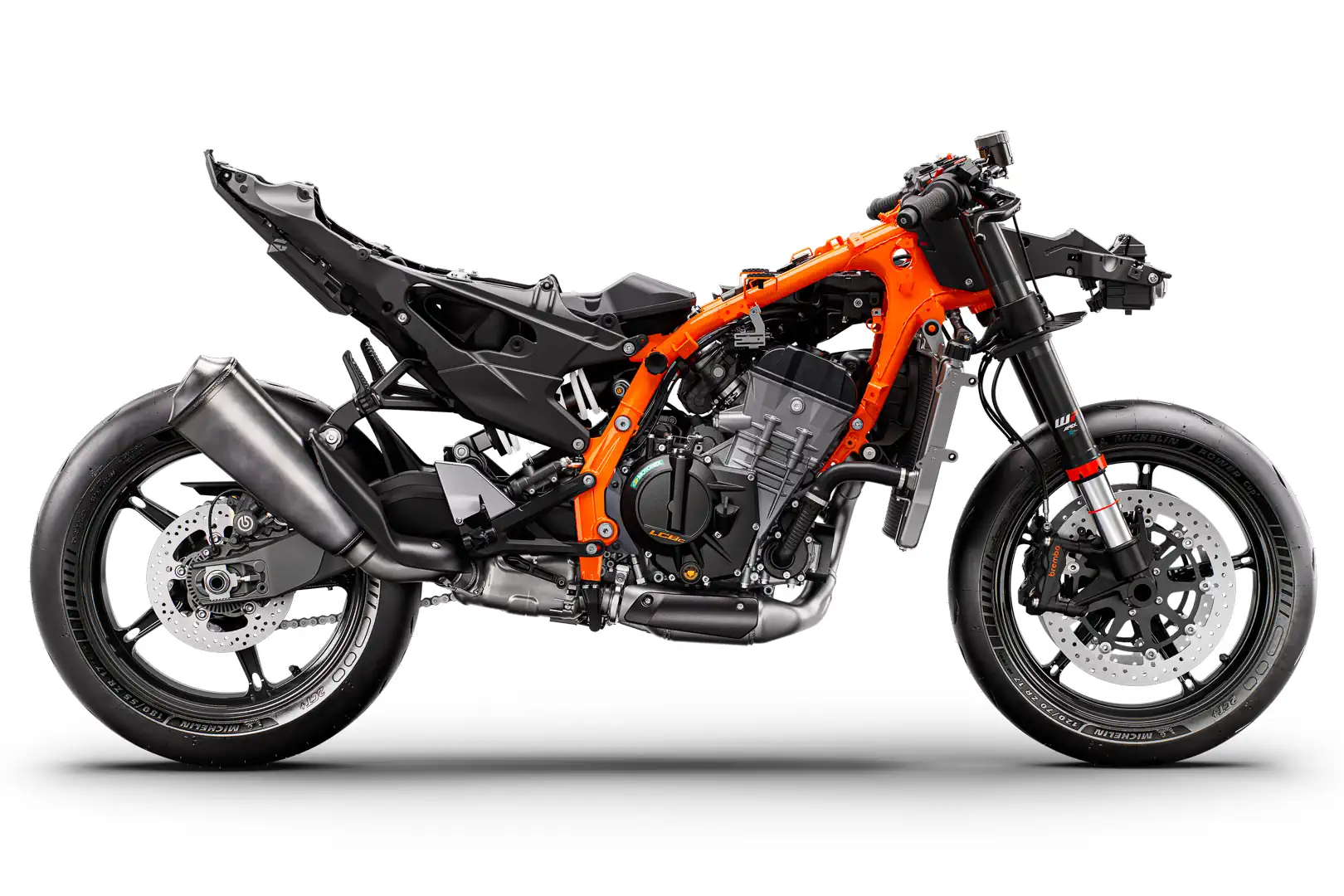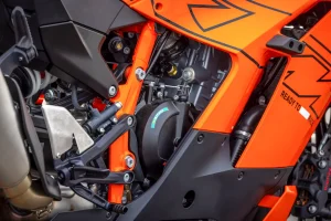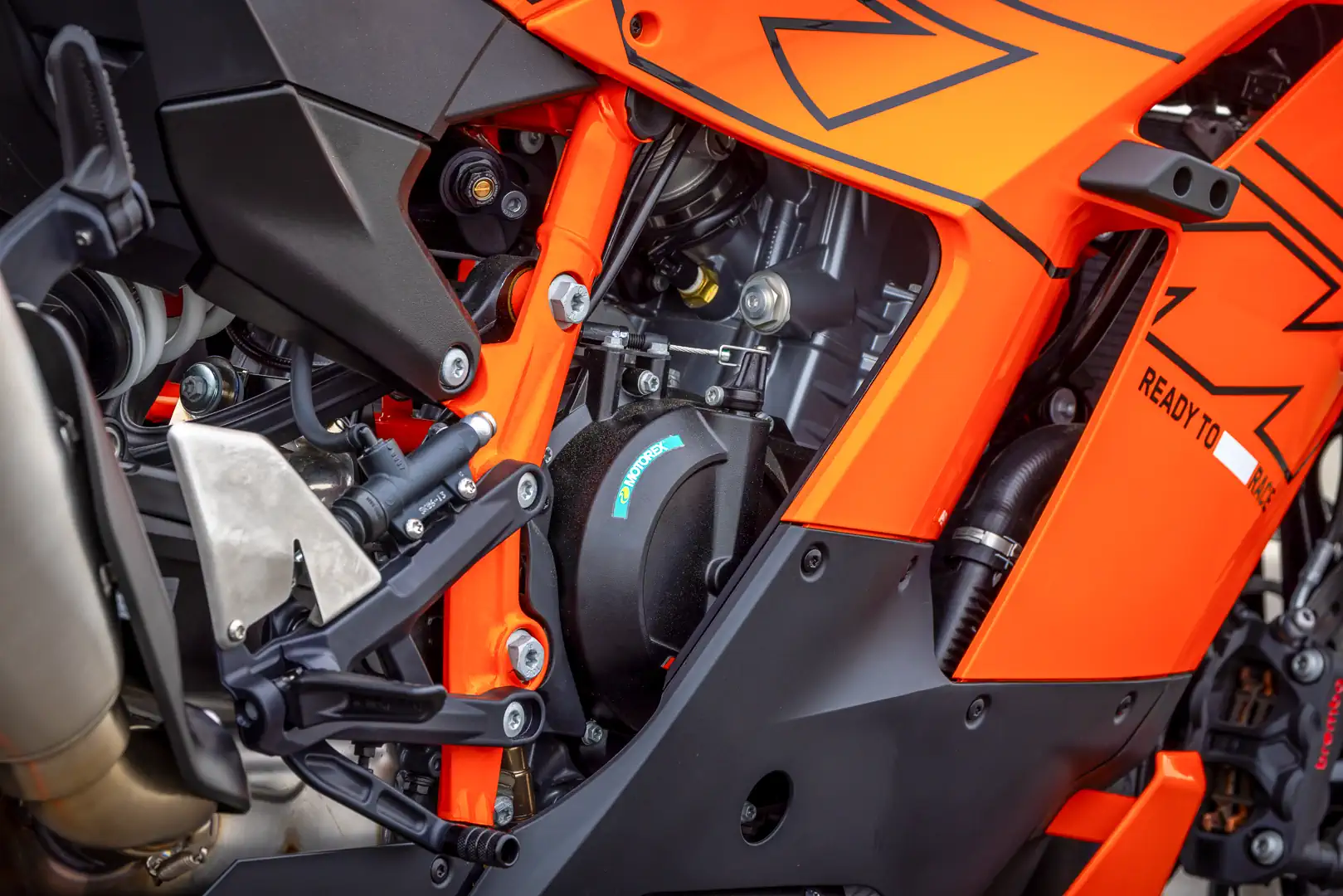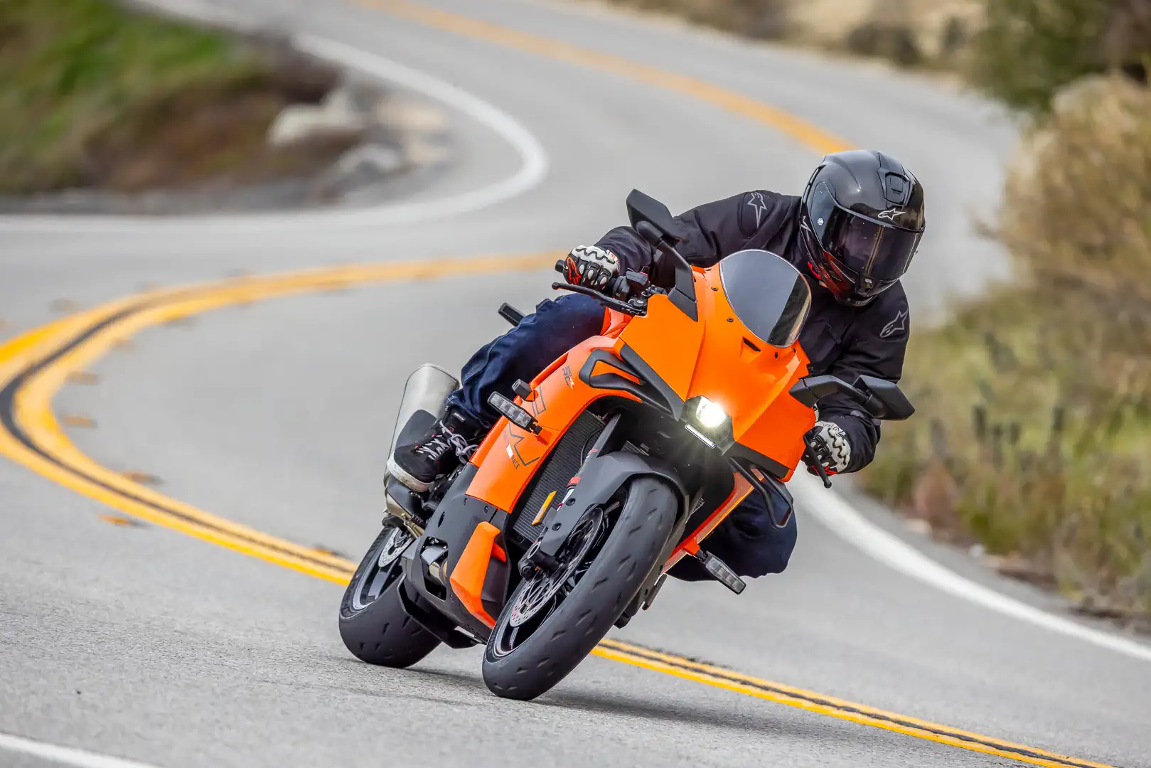 - The 2026 KTM 990 RC R’s parallel-twin feels like an inline-four. Unlike most twins, which hit hard with strong initial torque, the RC R builds power progressively and revs freely, almost like an inline-four. While long-time KTM riders might find this character unexpected, it’s an ideal formula for track performance. The smoother delivery of the 128-horsepower motor allows riders to open the throttle earlier and more aggressively without unsettling the bike mid-corner. Even on the street, the engine’s predictability makes the bike easier to ride and less tiring around town.