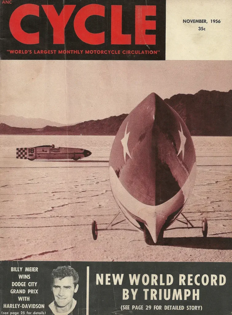 The cover story of Editor/publisher Floyd Clymer’s November 1956 issue of Cycle magazine is the story of the world motorcycle land speed record set with a normally aspirated, fuel-burning (80/20 methanol/nitromethane) Triumph streamliner piloted by Texan Johnny Allen at the Bonneville Salt Flats.