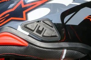 A-Connect’s functionality mirrors that of a Sena 60S. However, the Alpinestars system uses a proprietary four-button layout located toward the rear of the helmet, located behind the collarbone armor sections. Riders can also use voice commands for calls, music, and navigation. In practice, the rearward button location is a bit of a stretch and takes some getting used to, but owners will develop muscle memory.