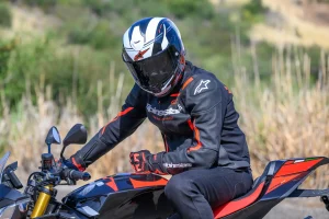 The R7 is engineered from the outset to accept the $550 Alpinestars A-Connect communication system, developed by Sena Technologies and based on its flagship Sena 60S communicator. The internal speaker pockets and routing channels are pre-cut into the cheek pad foam, leaving us with a sleek, properly fitting helmet that doesn’t create pressure points from added hardware. The result is a clean, fully integrated setup rather than using a bulky exterior-mounted clamp-on communication device.