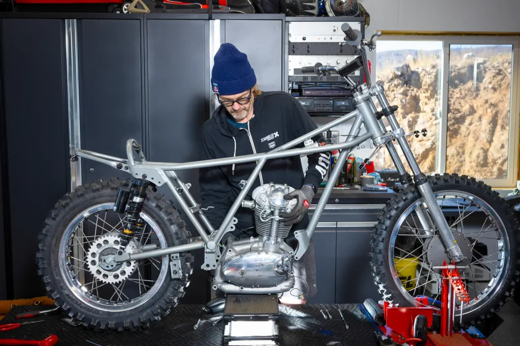 The rest of the build drew on a set of performance partners. Dubya USA supplied the wheels, consisting of Excel rims, Bulldog nipples and spokes, and hubs boasting a Cerakote polymer-ceramic composite coating. Pirelli Scorpion Mid-Hard XC tires were spooned on. Race Tech reworked the fork with gold valves, laid-down G3-S custom shocks handled rear suspension duty. FMF Racing fabricated a custom one-off titanium exhaust with a spark arrestor. Pro-Bolt titanium hardware was used throughout, along with a custom aluminum skid plate. The swingarm was modified from a Ducati narrow case single, a detail that matters to anyone who’s dealt with these frames and knows how thin the aftermarket support is. Rather than the original yellow paint, Chinnock went with livery inspired by the 450 R/T prototype.