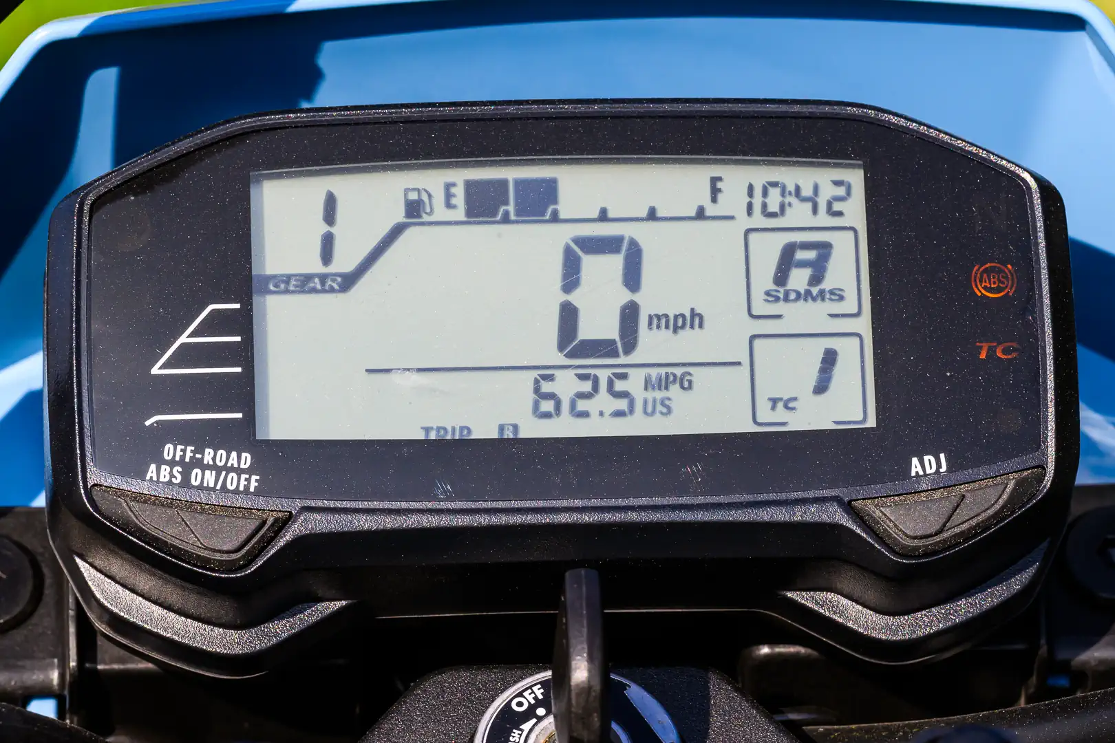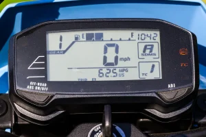 - We didn’t get the wanted 6th gear, and that matters more on the SM than the dual-sport S DR-Z4 variant. For trail riding and working the back roads, it’s easier to overlook the lack of a six-speed transmission. However, if you’re an urban rider who spends time on the freeway, you’ll feel constrained by the transmission. Accelerating to run with the big dogs, you’ll hit 5th gear before you know it, and mounting vibration gets more of your attention than how quickly you’re spooling up competitive freeway speeds. At 55 mph or higher, you’ll constantly be looking down at the LCD dash and have that “5” gear indicator looking back at you, dashing any hopes of shifting up one more time to relax the ride. It was a cost-saving move by Suzuki, as the $8999 MSRP is already high for the 400 class.