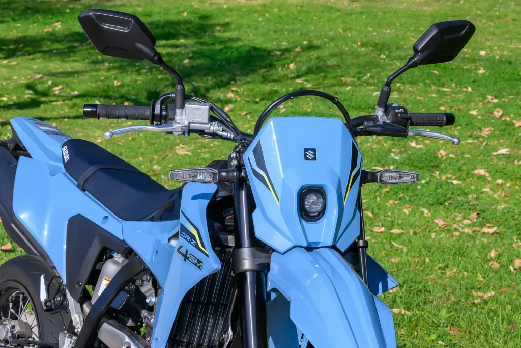 - The ergonomics on the 2026 Suzuki DR-Z4SM are outstanding. It helps if you’re used to riding dirt bikes, as the layout will feel highly familiar. Suzuki opened up the rider triangle a bit for the DR-Z4SM compared to the DR-Z400SM, which larger riders will prefer. Five-foot-six Associate Editor Kelly Callan was fine with the 35-inch seat height, though she is an experienced dirt bike rider. My 31-inch inseam allows me to have both toes firmly touching the pavement at stops, though I’m nowhere near flat-footed. That’s not an issue, as the bike weighs just 340 pounds and the wide handlebar allows plenty of leverage at a stop. While the tall seat height might intimidate new riders, the suspension has enough squish to accommodate a wide audience. If shorter riders give it a chance, they’ll be rewarded with a fun way to learn the ropes of street riding.
